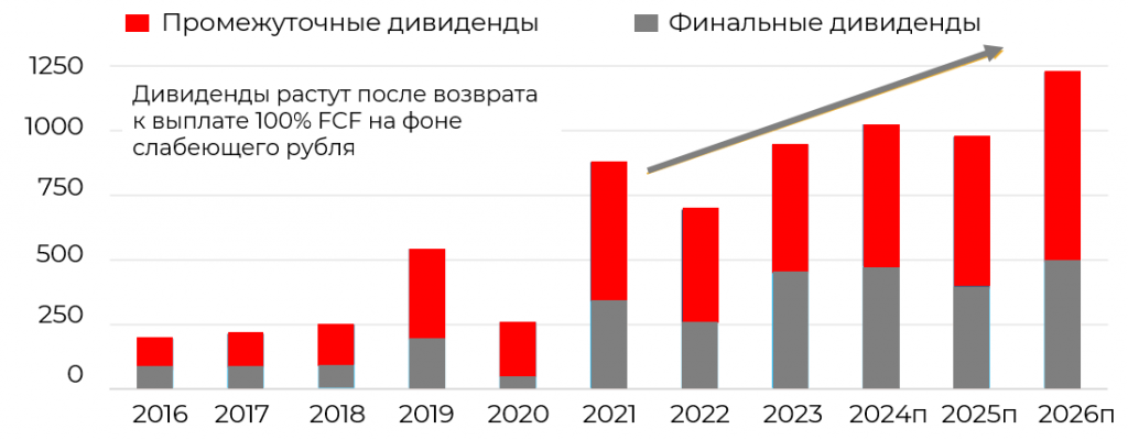 В 2023 году Лукойл выплатил рекордные дивиденды — 945 рублей на акцию. Коэффициент выплат составил 75% от свободного денежного потока, так как часть денег пошла на ремонт завода и резерв под выкуп акций у нерезидентов. В этом году ситуация похожая: дивиденды за 9 месяцев 2024 года — 514 рублей на акцию. Мы ожидаем, что через 2-3 года Лукойл вернётся к практике распределения 100% свободного денежного потока в виде дивидендов.